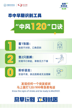 2025年10月29日是第20个“世界卒中日”。今年,世界卒中组织(World Stroke Organization, WSO)确定的全球核心口号为:“Every Minute Counts. Know the signs of stroke. Act FAST.”(分秒必争,识别卒中,快速行动)。结合我国实际情况,中国卒中学会发布了2025年世界卒中日中文主题为:“尽早识别,立刻就医”。二、卒中防治小妙招记住“120口诀”,把握黄金4.5小时!