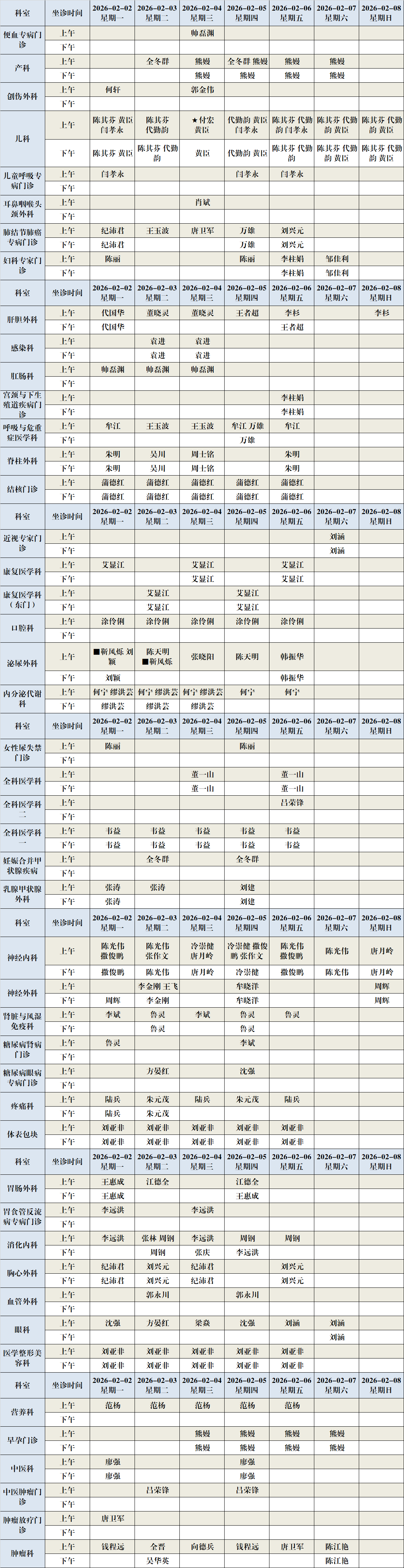 重庆大学附属江津医院2025年1月26日至2月1日专家(含特聘专家)坐诊排班如下: