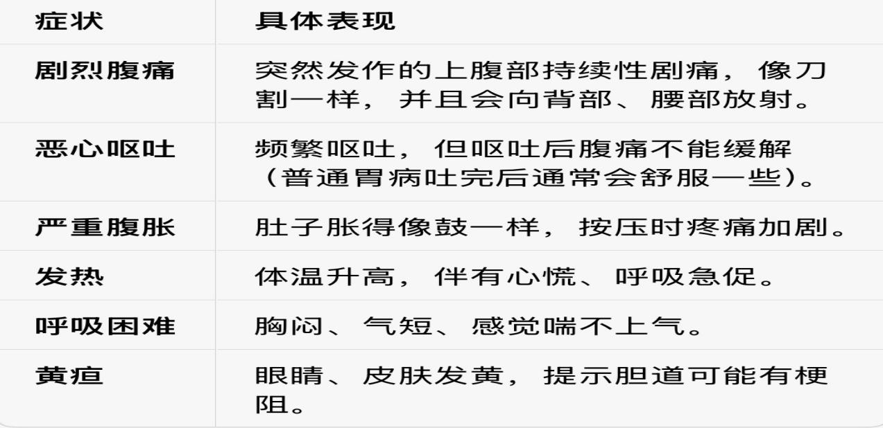 很多患者在发病初期,都以为是“吃坏了肚子”或“胃病犯了”,想忍一忍。但重症胰腺炎的疼痛和普通胃痛完全不同。如果出现以下症状,请立即就医,不要耽误: