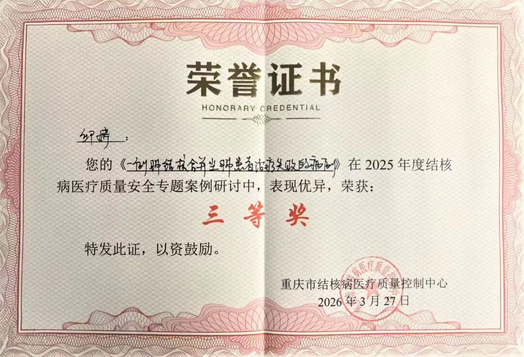 日前,2026年重庆市结核病、艾滋病诊疗管理暨结核病、艾滋病、呼吸道传染病医疗质量工作培训会在重庆落下帷幕。重庆大学附属江津医院(江津区中心医院)感染科选派的参赛选手在全市结核病诊疗案例研讨比赛环节获得三等奖。