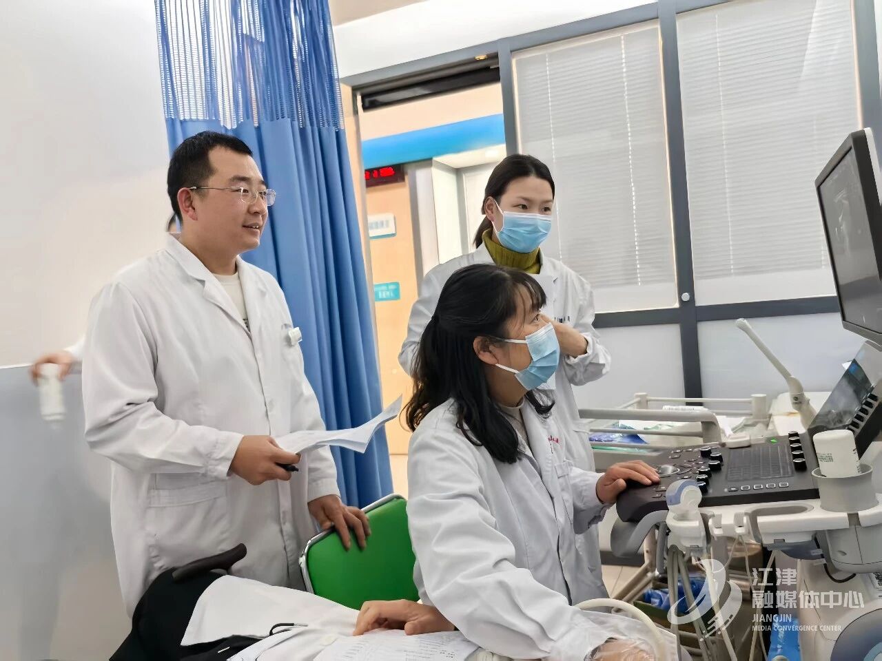 4月7日,重庆大学附属江津医院(江津区中心医院)超声科诊室里,一位年轻患者平躺在检查床上,神情紧张。患者身边,一位拄着拐杖的医生微微侧身,左手轻按在她的肩头,声音温和:“别担心,放松呼吸,我慢慢检查。”