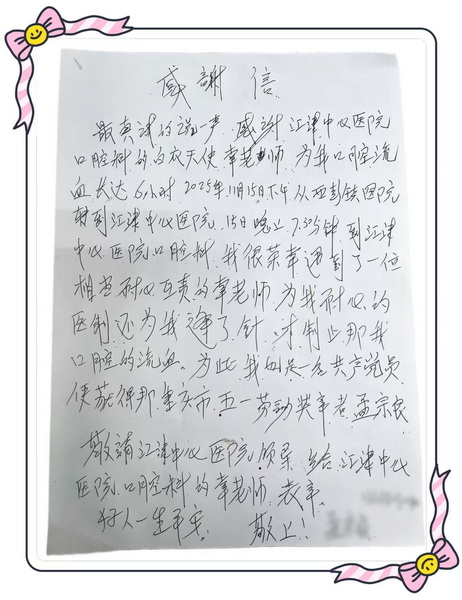 “患者自诉口腔出血超过6个小时,一直无法止血,请马上安排医生来急诊科会诊……”11月15日晚6时许,来自急诊科的一通电话打破了口腔科的宁静。值班医生辜文妍接到电话后,立即赶往急诊科查看情况。患者手写的感谢..