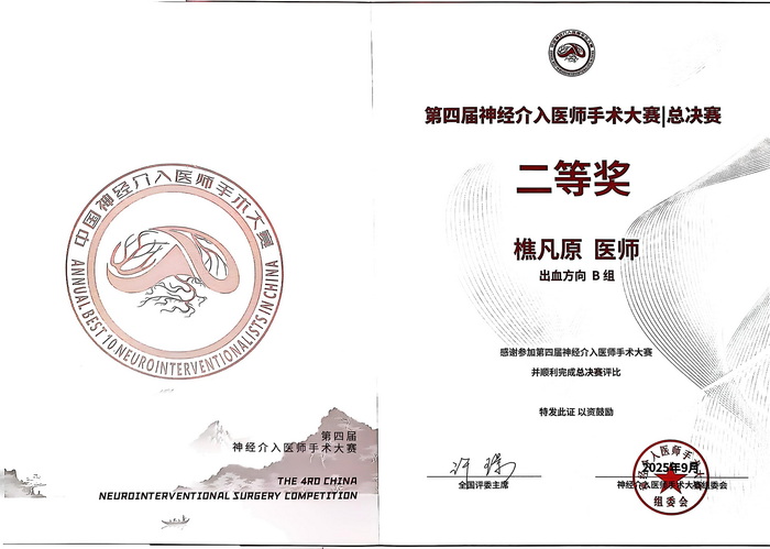 近日,第四届中国神经介入医师手术大赛全国总决赛在江苏省常州市落下帷幕。经过激烈的角逐,重庆大学附属江津医院神经外科樵凡原医师凭借精湛的手术技艺与深度的病例剖析,从来自全国各地医疗机构的精英选手中脱颖而出,斩获全国二等奖。