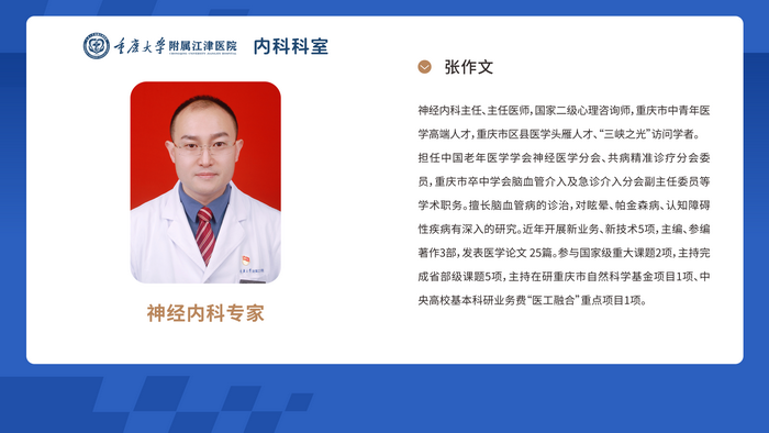 重庆大学附属江津医院卒中中心于2021年通过国家卫生健康委脑卒中筛查与防治工程委员会“综合防治卒中中心”认证,2025年通过“高级卒中中心(三级医院卒中中心)”现场验收评估。卒中中心由神经内科牵头,整合神经外科、急诊科、重症医学科、麻醉科、康复医学科、放射科、医学检验科等多个科室专家资源,每年救治卒中患者超过2000例,行静脉溶栓、动脉取栓手术超过300例,抢救成功率90%以上。诊疗范围:急性脑梗死、脑出血、蛛网膜下腔出血的诊治及康复治疗。