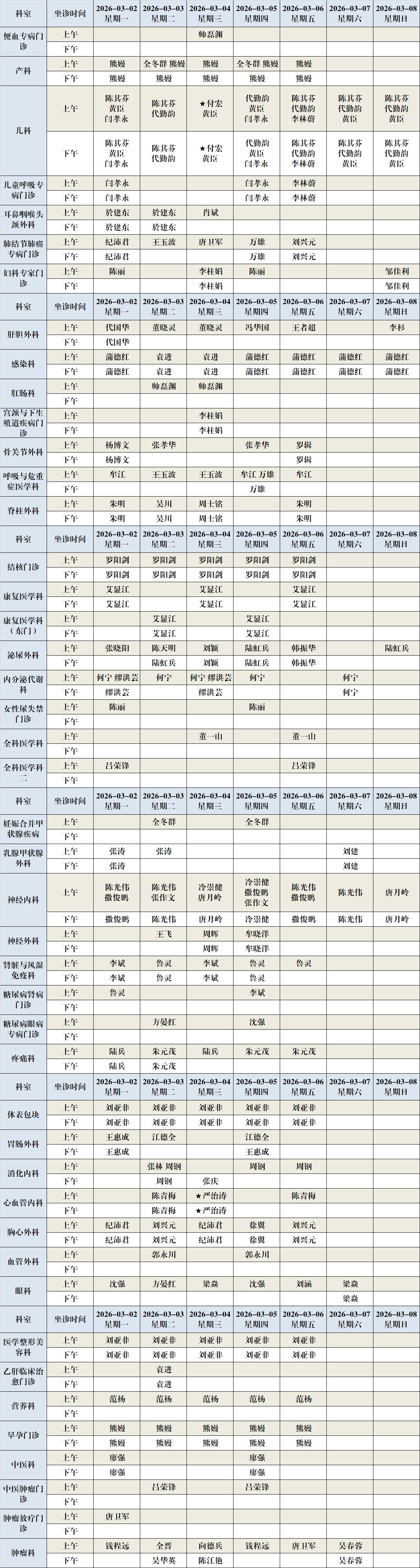 重庆大学附属江津医院2026年3月2日至3月8日专家(含特聘专家)坐诊排班如下: