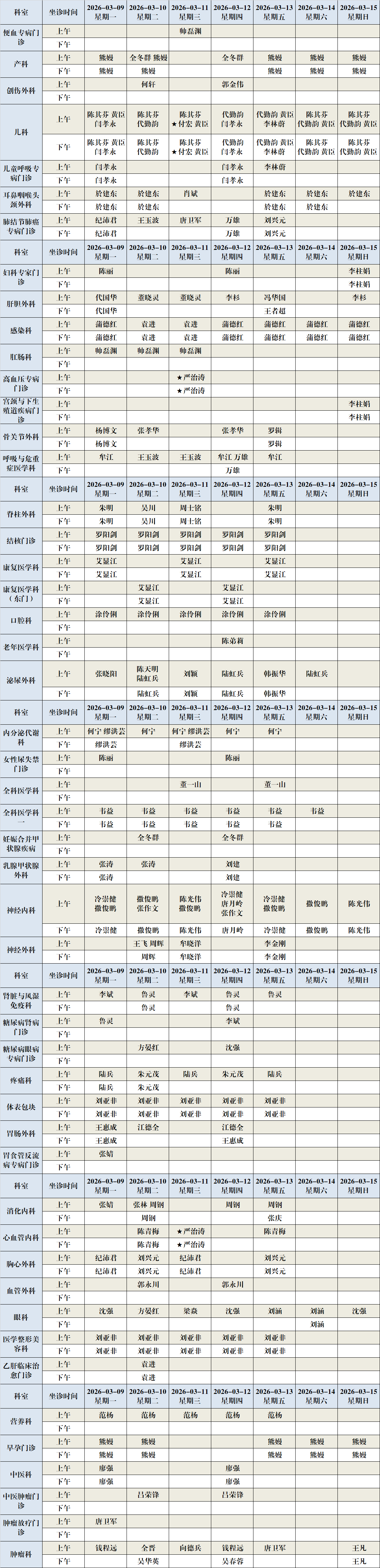 重庆大学附属江津医院2026年3月9日至3月15日专家(含特聘专家)坐诊排班如下: