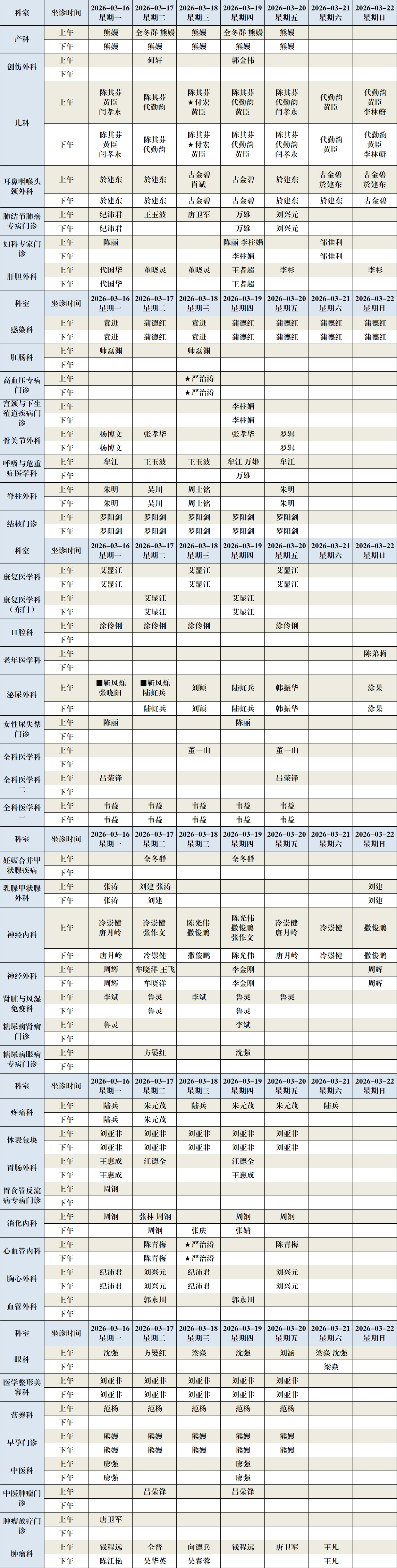 重庆大学附属江津医院2026年3月16日至3月22日专家(含特聘专家)坐诊排班如下: