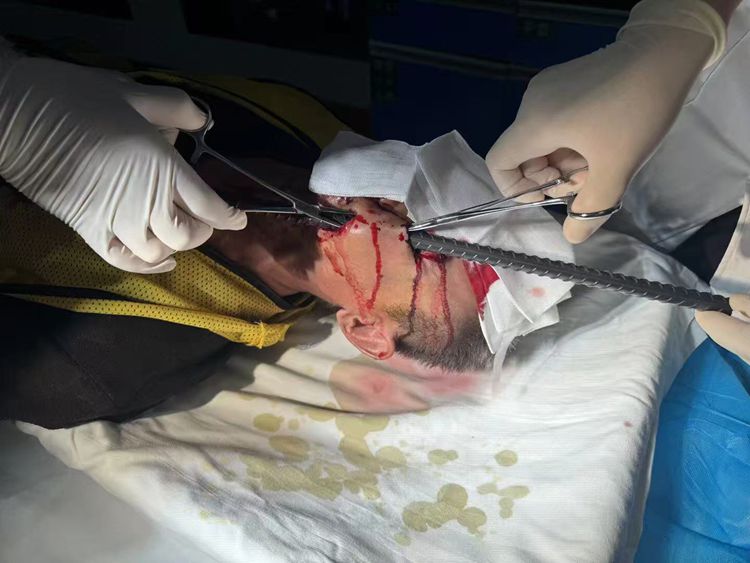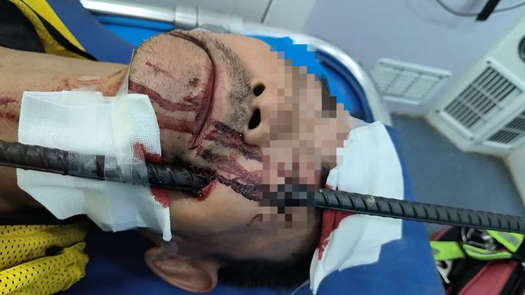 “嘀——嘀——”2025年9月2日17时05分,重庆大学附属江津医院急诊科外,120急救车的警笛声划破傍晚的宁静。车门打开,一名面部插着钢筋的患者被紧急推送入院,钢筋从左侧面颊贯穿至颞部,鲜血浸湿了纱布,情况危急。