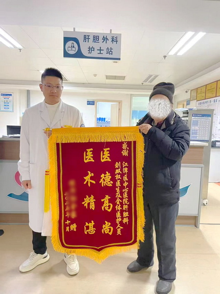 “刘医生,今天我们出院了,特意做了一面锦旗送给你,你这段时间费心了!”近日,重庆大学附属江津医院肝胆外科发生了温情一幕——93岁患者程爷爷的家属特意来到护士站,将一面绣有“医德高尚,医术精湛”的锦旗送到了刘双权医生的手中,表达全家人的谢意。